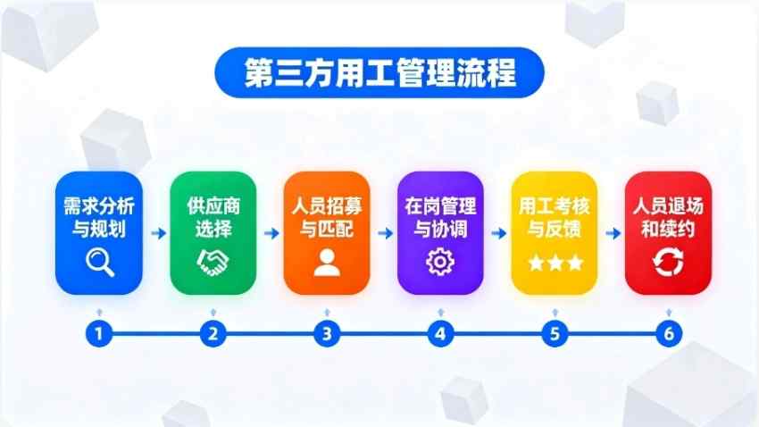關(guān)于第三方人力管理流程,通用的流程框架主要包括以下幾個(gè)環(huán)節(jié):
