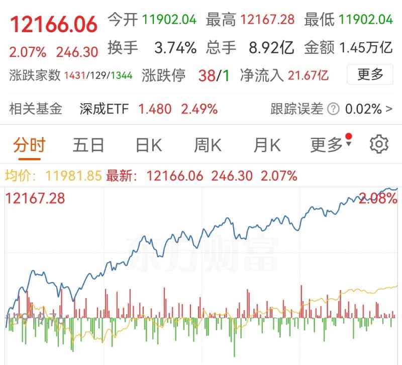 另外,深圳指數達到12166.06點,深市成交金額1.45萬億,有38家漲停,凈流入21.67億元。