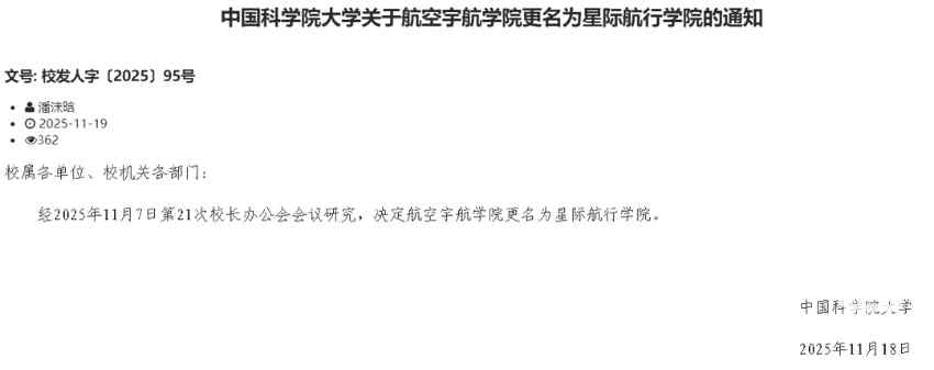 國科大官方確認!航空宇航學院正式更名為星際航行學院,11月7日校長辦公會審議通過,18日發內部通知,選課系統已啟用新名,官網后續完成“流程”后更新。